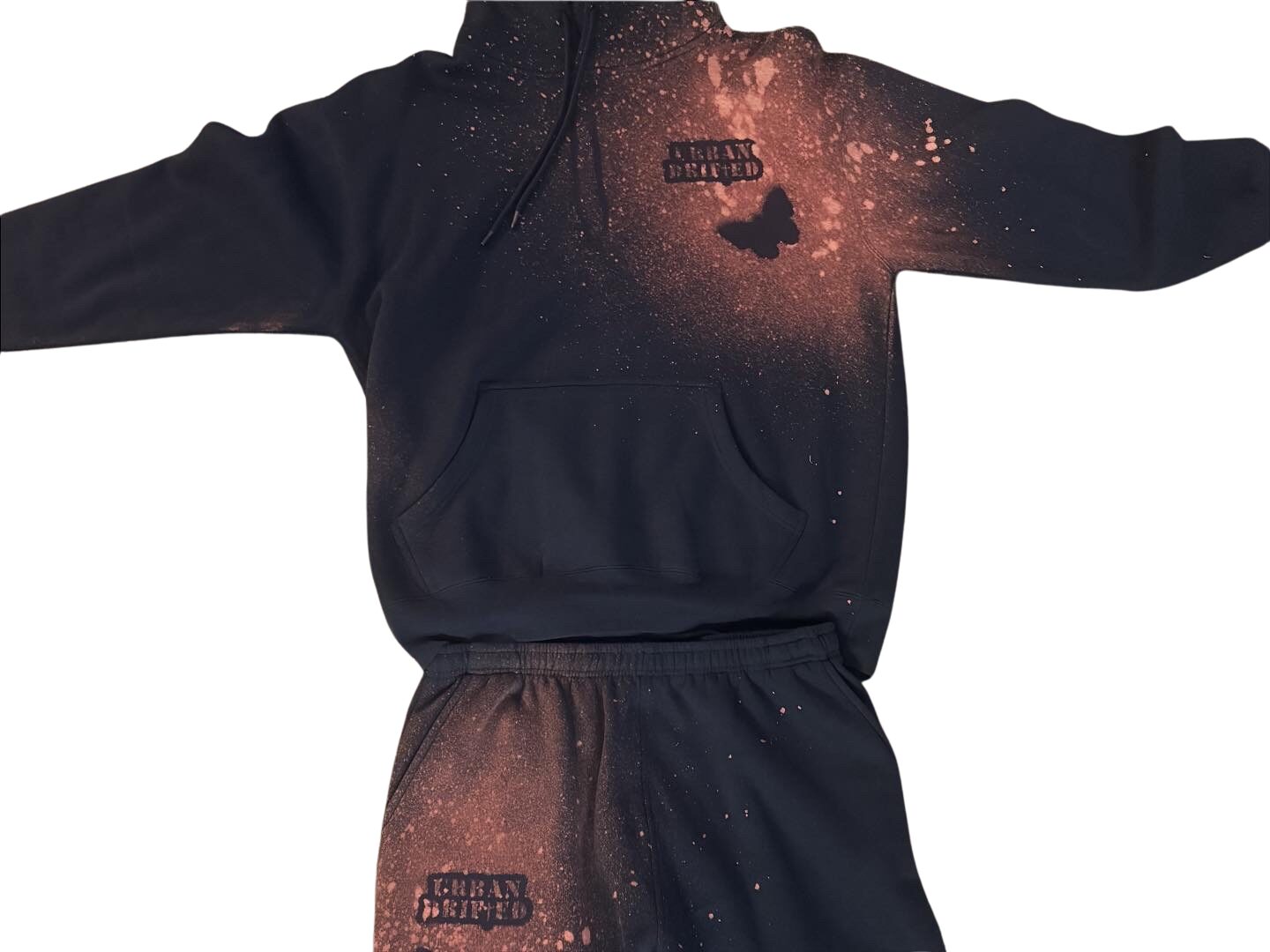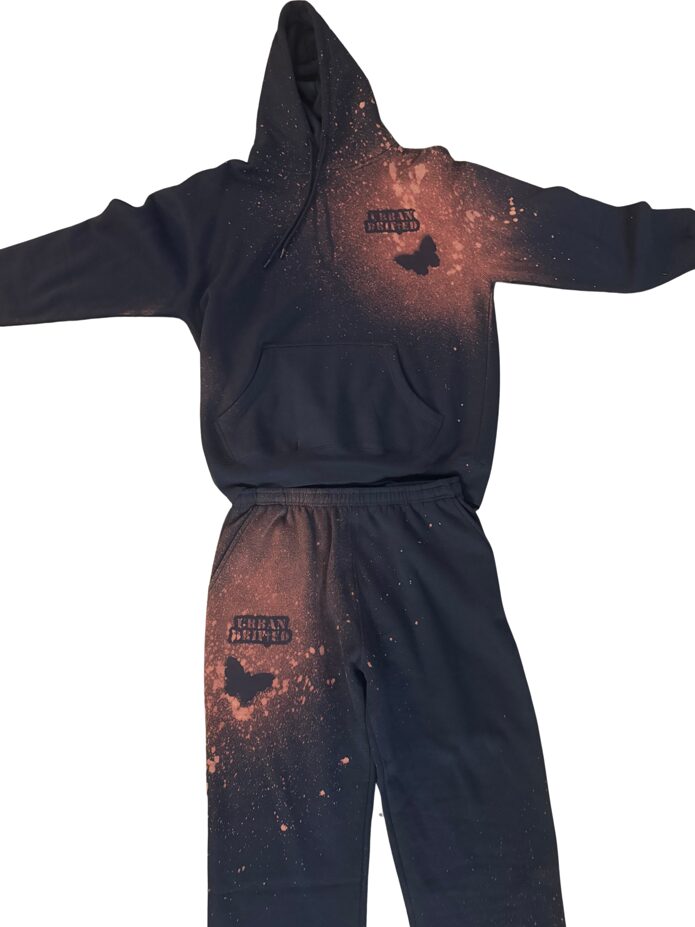 The Night Shift Sweatsuit blends the mystery of midnight tones with the creative power of hand-bleached streetwear art. Designed and hand-created in Las Vegas by Gino (@theoriginalginoo), this set embodies authenticity, movement, and purpose. Each hoodie and jogger is designed by hand creating a burnt-orange almost pinkish wash blending into a galaxy-like fade across deep midnight blue fabric — no two sets are ever the same.